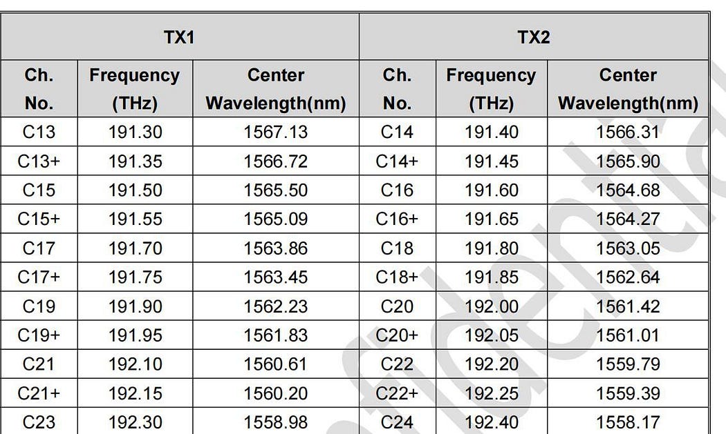The two channels of the transceiver meet above wavelength table. And other channel wavelength